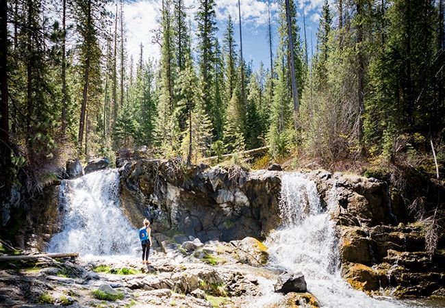 About 10 miles west of Bend, Tumalo Falls is one of the most popular sights in the area. The 97-foot waterfall plunges off a sheer wall to the roaring river below. You can view the falls from an observation area near the parking lot, which looks up the river to the wall of water pouring over the cliff. This is the best view of the falls, but if you want a closer view and a different perspective, you can also hike up a .2-mile trail that leaves from near the restrooms at the Tumalo Falls Picnic Area. At the edge of the falls is a fenced area, where you can look down on the falls.
