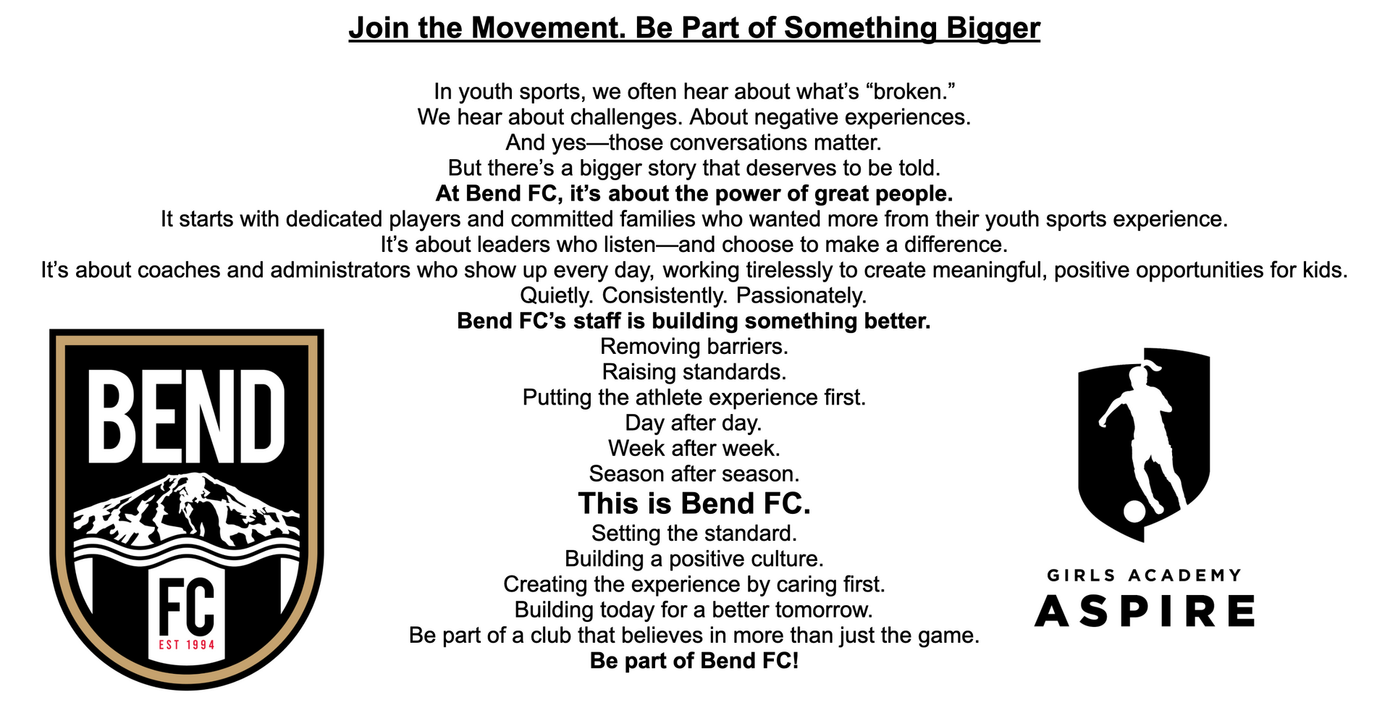 Bend FC, is a 501(c)(3) nonprofit organization, EIN #20-2573582. Your donations are tax-deductible to the extent permitted by law.