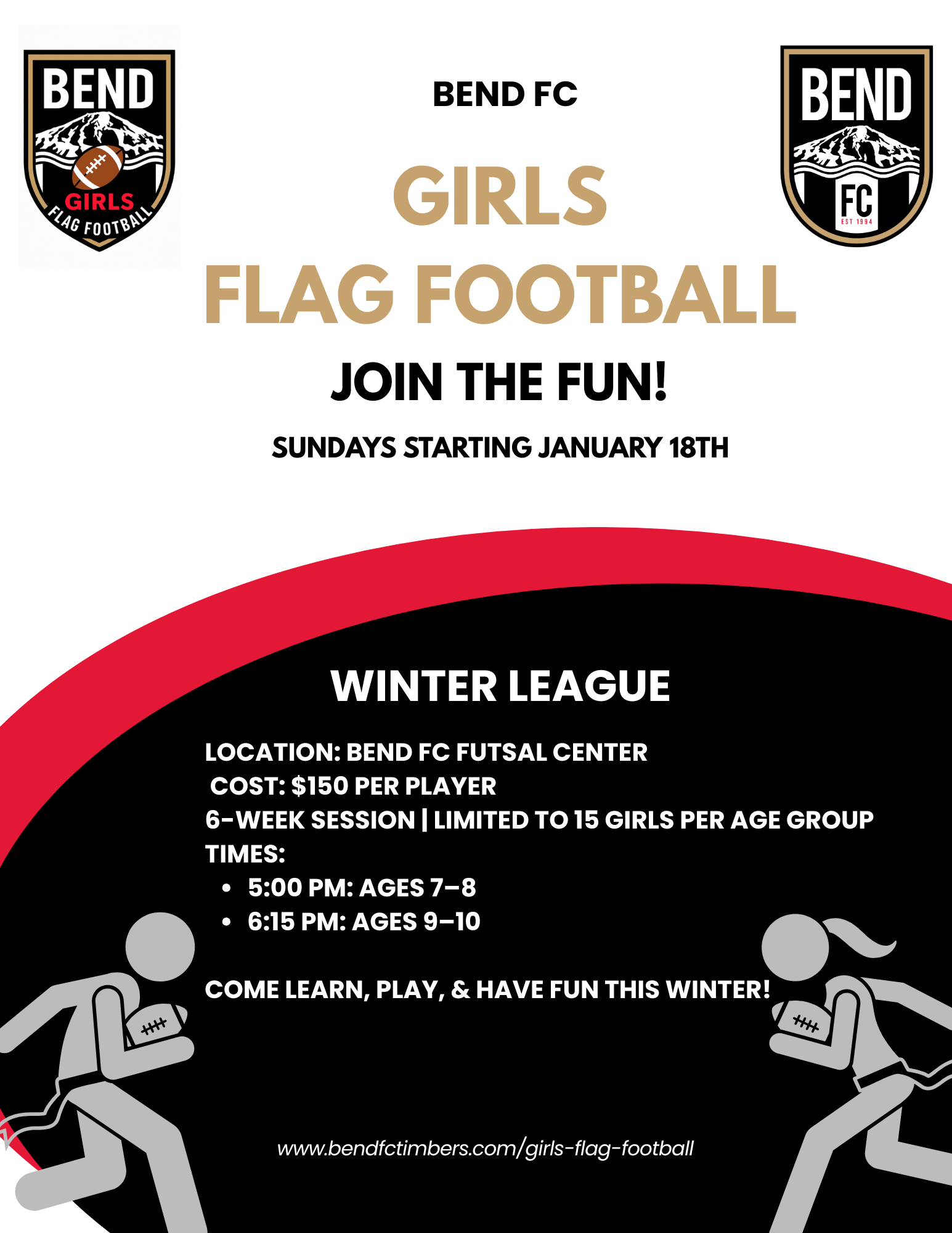 Spots are limited and expected to fill quickly — don’t miss this opportunity to be part of the inaugural season of Girls Flag Football at Bend FC!