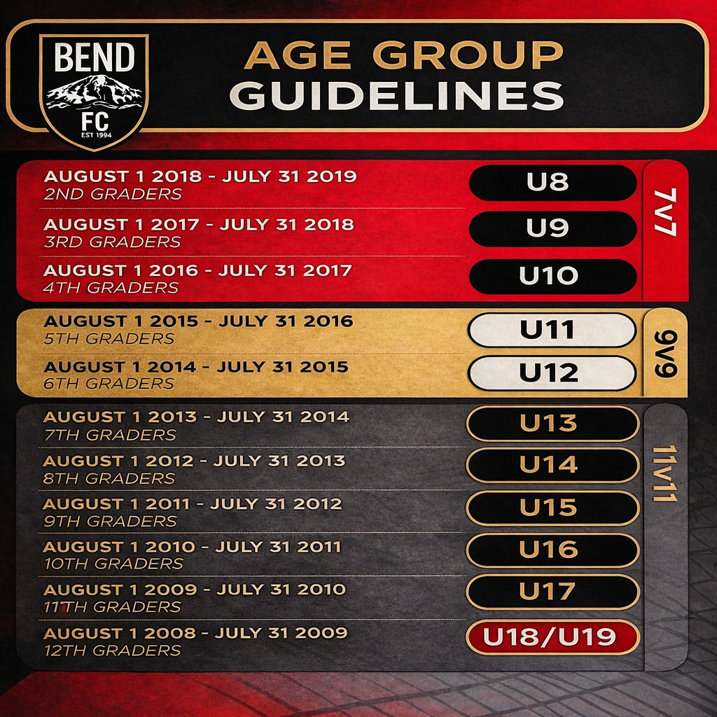 - Purchase the full required Bend FC Uniform kit. Details provided after tryouts, via email. The uniform costs are not included in season fees. Uniforms are on a two-year cycle. The 2026-2027 season is the first year of a new cycle.